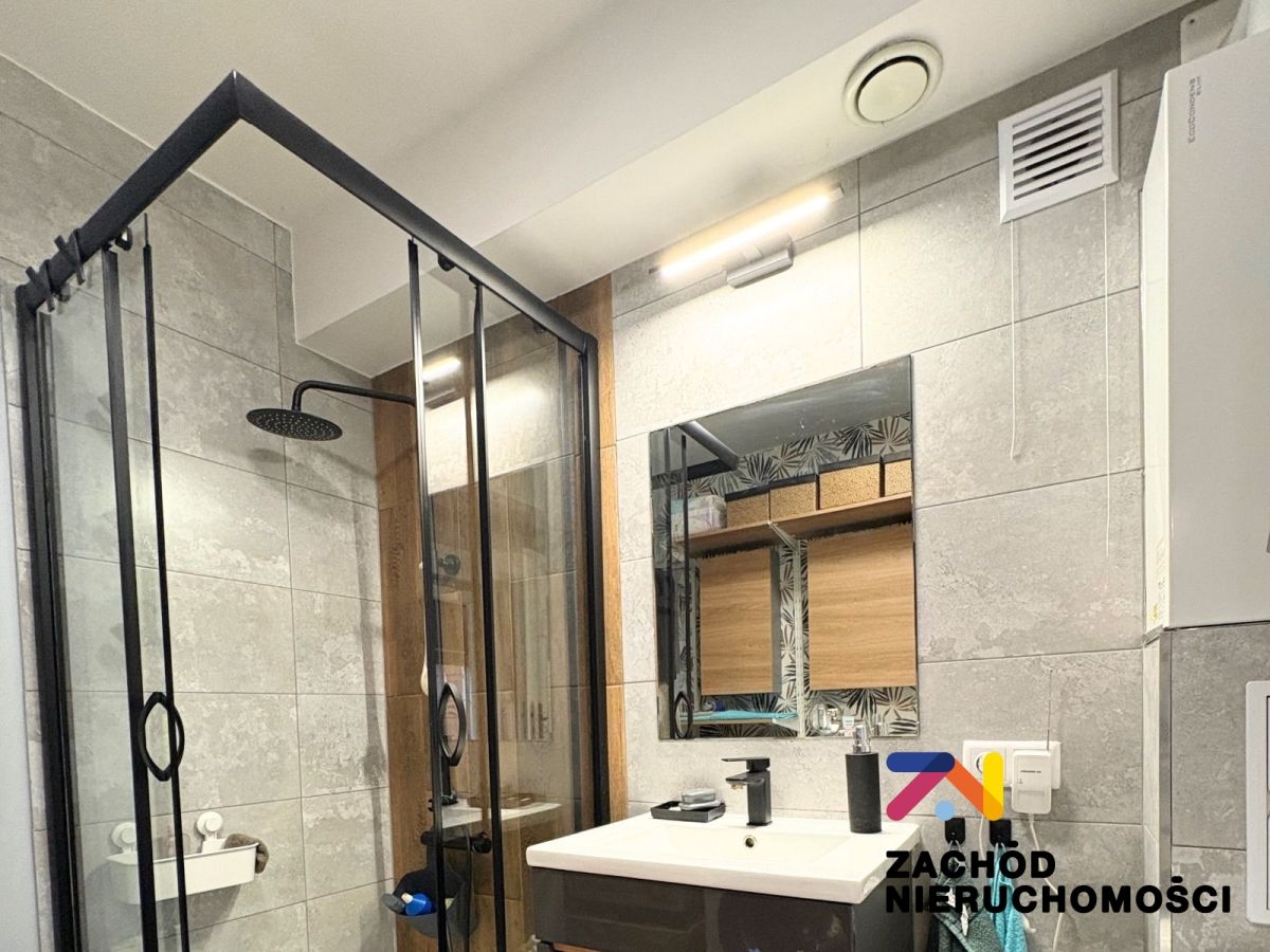 - Podłogi wykończone panelami drewnopodobnymi, w łazience zastosowano płytki.