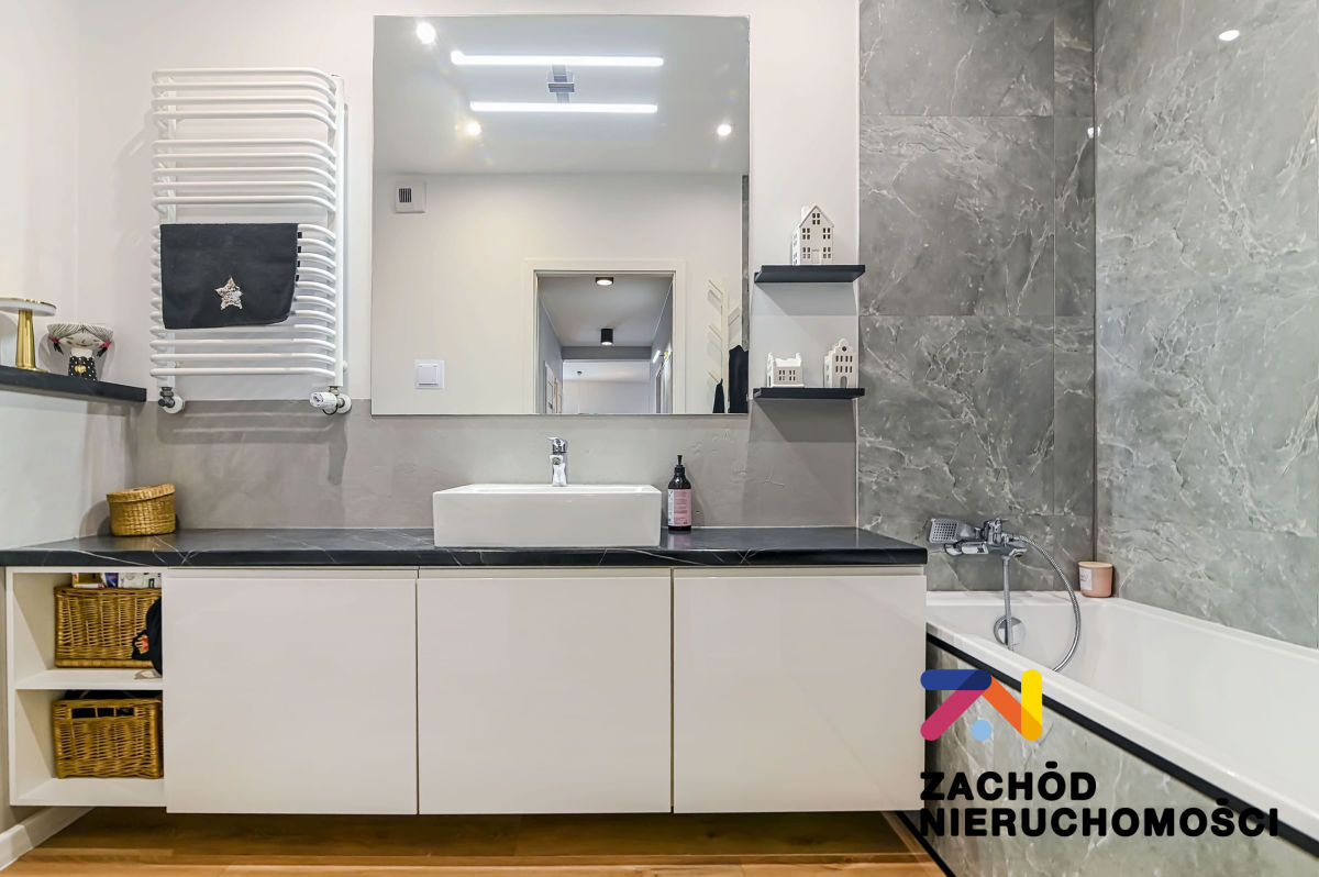 Budynek z 2019 roku. Apartamentowiec wykończony w nowoczesnym stylu z windą. Mieszkanie wykończone z wysokiej jakości materiałów budowlanych. Ściany gładzone i malowane. Okna PCV z roletami zewnętrznymi, antywłamaniowymi. Kuchnia umeblowana i wyposażona: lodówka w zabudowie, zmywarka, płyta indukcyjna, piekarnik elektryczny. W łazience wanna, umywalka, wc. W pomieszczeniu gospodarczym regały. Dodatkowo w zabudowana garderoba, szafa w przedpokoju oraz sypialni. Dodatkowe umeblowanie do uzgodnienia.