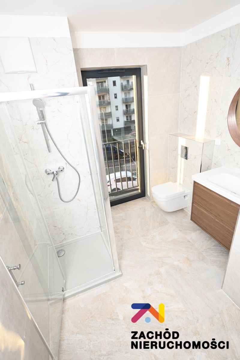 Budynek z windą, wykończony w nowoczesnym stylu, z wysokiej jakości materiałów budowlanych. Mieszkanie wykończone, ściany gładzone i malowane, na podłogach panele i płytki w zależności od pomieszczenia, okna PCV. Kuchnia umeblowana i wyposażona: piekarnik, płyta ceramiczna, lodówka, meble kuchenne. W łazience kabina prysznicowa. W łazience kabina prysznicowa.
