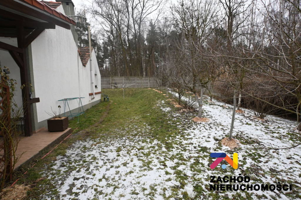 Działka w pełni zagospodarowana, teren ogrodzony z bramą wjazdową oraz z tyłu furtką do lasu. Część posesji pokryta kostką brukową, na pozostałej części trawa oraz liczne nasadzenia.