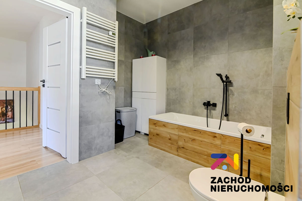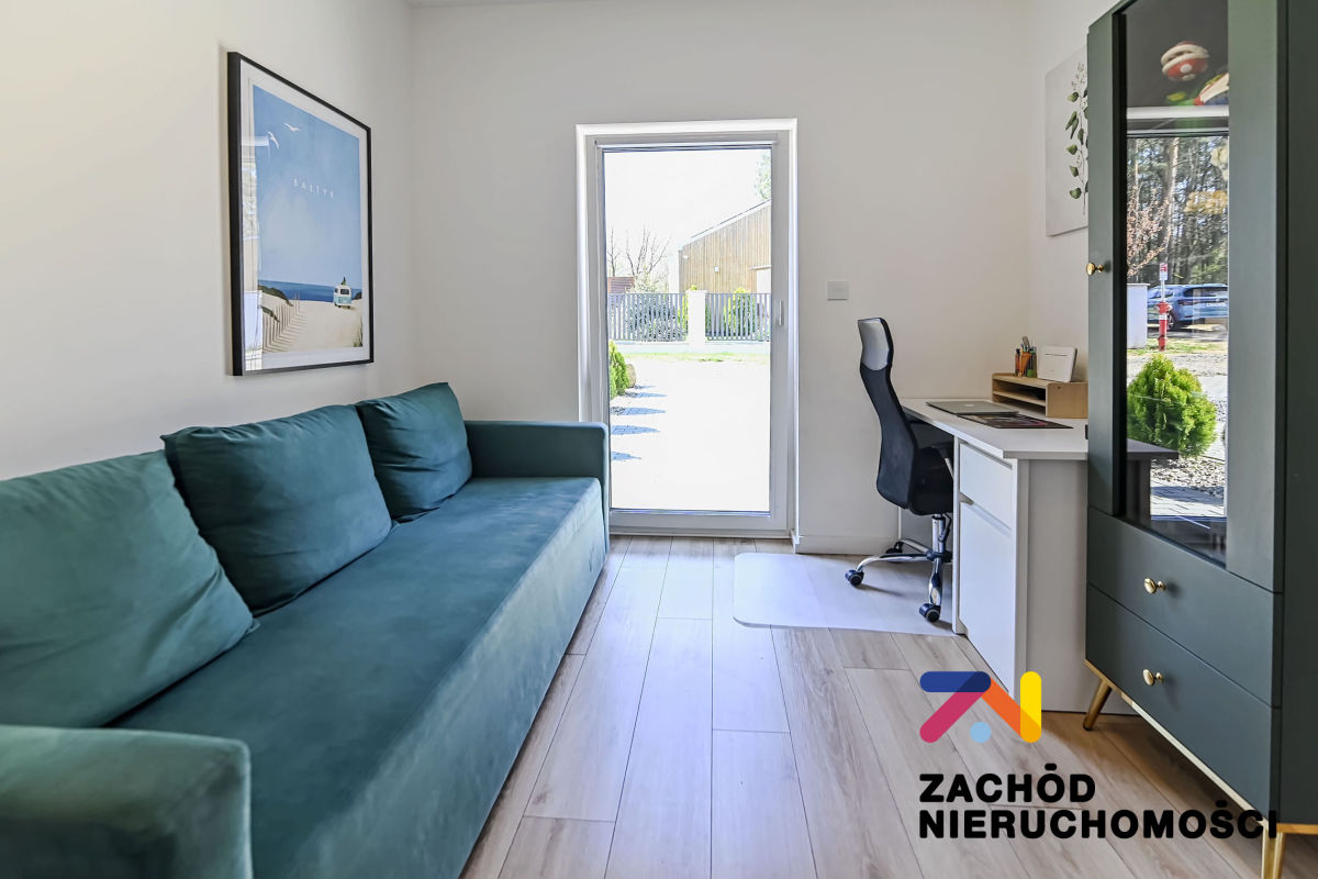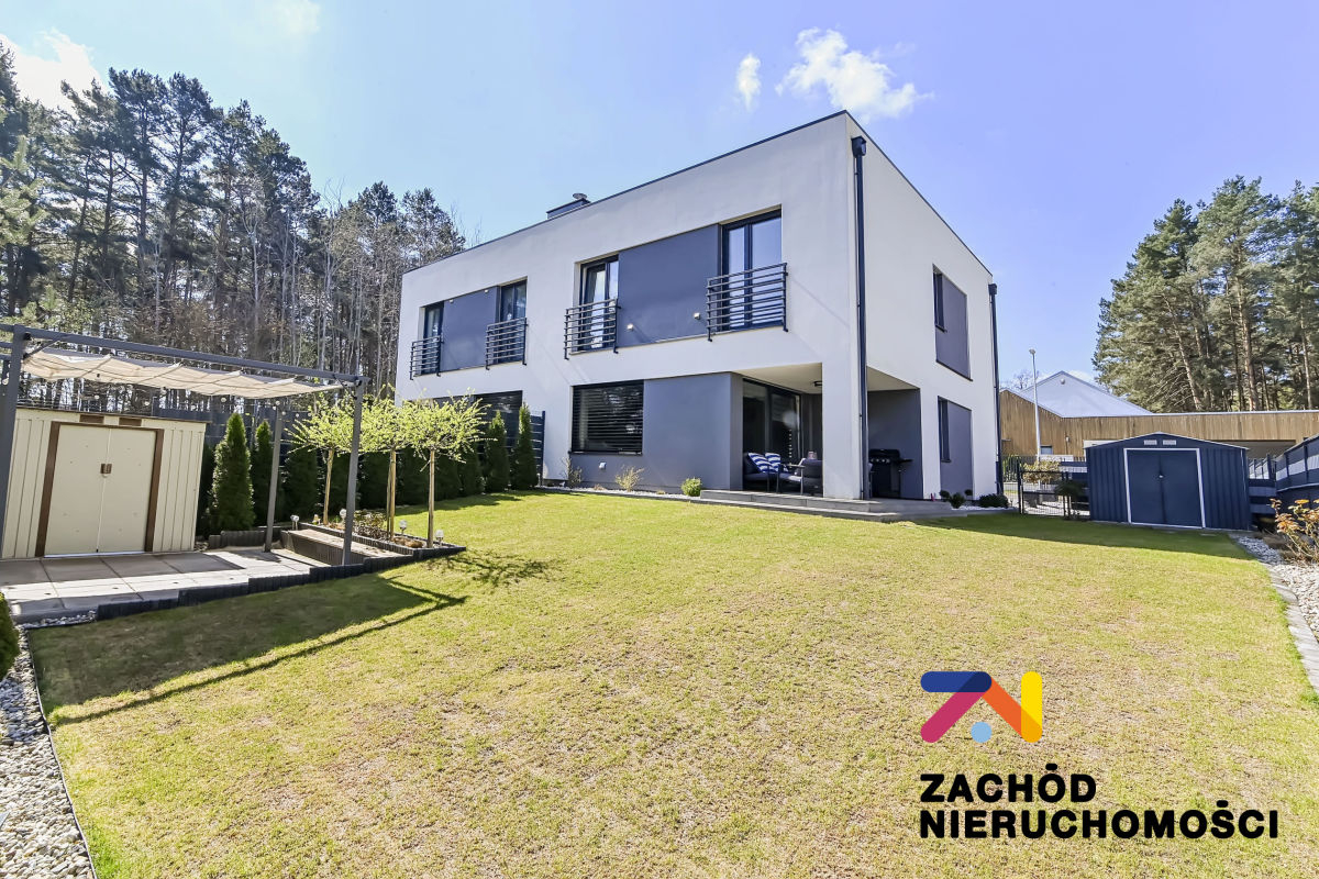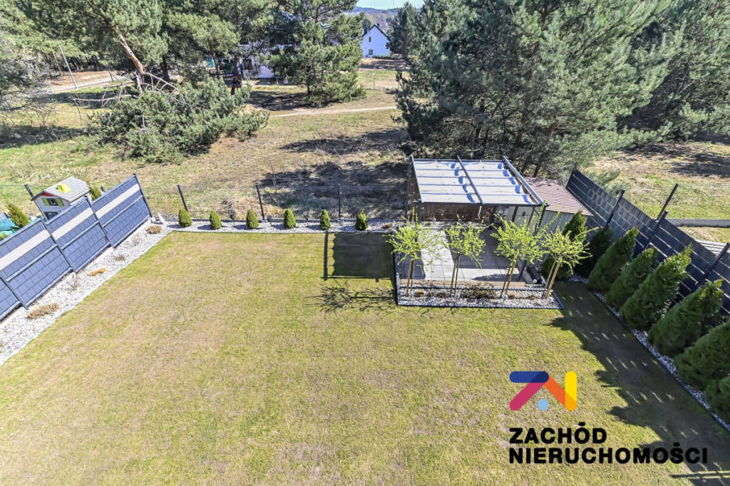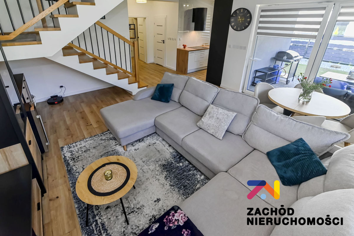 Budynek oddany do użytku w 2022 roku, wybudowany z bloczków betonu komórkowego Ytong. Ściany budynku ocieplone styropianem. Okna PCV z roletami zewnętrznymi (elektryczne sterowane z telefonu) i wewnętrznymi, główne okno tarasowe rozsuwane. Ściany gładzone i malowane, na podłogach panele i płytki w zależności od pomieszczenia. W łazience na parterze prysznic na piętrze wanna. Kuchnia umeblowana i wyposażona: lodówka w zabudowie, piekarnik elektryczny, zmywarka, płyta indukcyjna, okap. W wiatrołapie szafa w zabudowie oraz na piętrze w sypialni duża garderoba. Pozostałe umeblowanie do uzgodnienia.