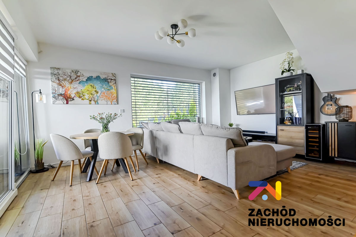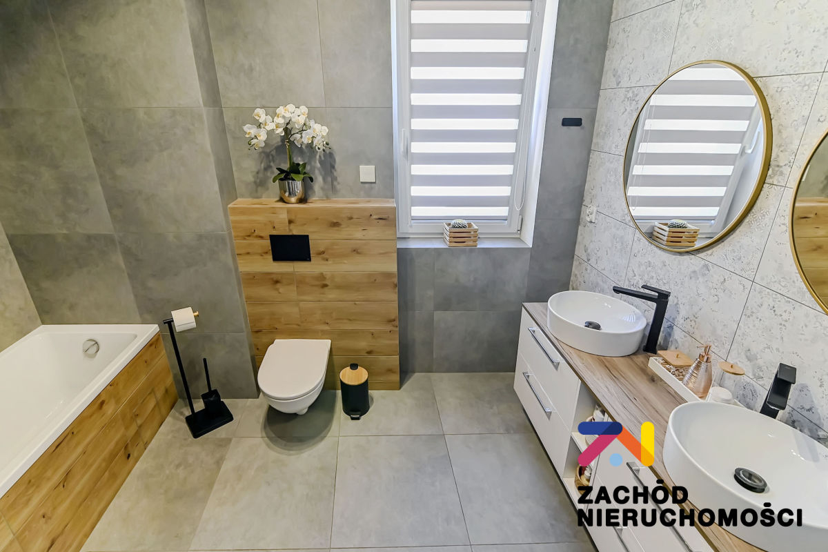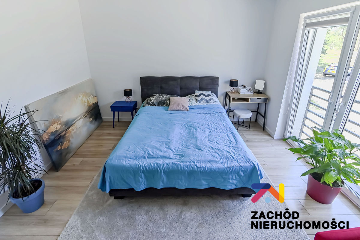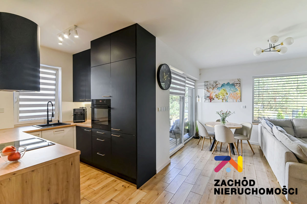 Budynek oddany do użytku w 2022 roku, wybudowany z bloczków betonu komórkowego Ytong. Ściany budynku ocieplone styropianem. Okna PCV z roletami zewnętrznymi (elektryczne sterowane z telefonu) i wewnętrznymi, główne okno tarasowe rozsuwane. Ściany gładzone i malowane, na podłogach panele i płytki w zależności od pomieszczenia. W łazience na parterze prysznic na piętrze wanna. Kuchnia umeblowana i wyposażona: lodówka w zabudowie, piekarnik elektryczny, zmywarka, płyta indukcyjna, okap. W wiatrołapie szafa w zabudowie oraz na piętrze w sypialni duża garderoba. Pozostałe umeblowanie do uzgodnienia.