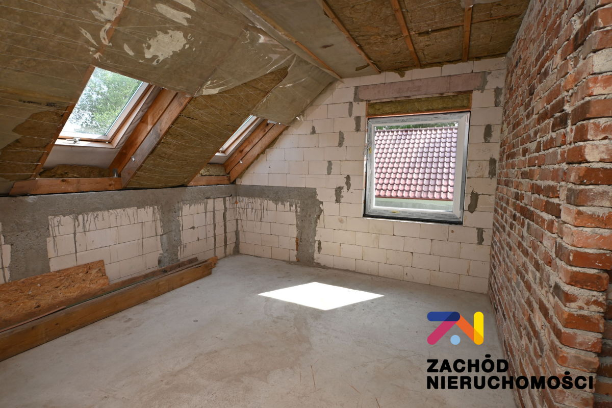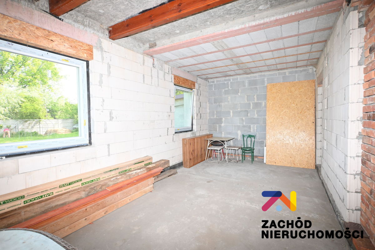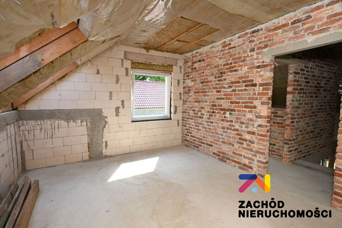 Budynek jest w stanie surowym zamkniętym. Widoczne ścianki działowe zostały wybudowane z cegły rozbiórkowej z pozostałości budynku na działce.