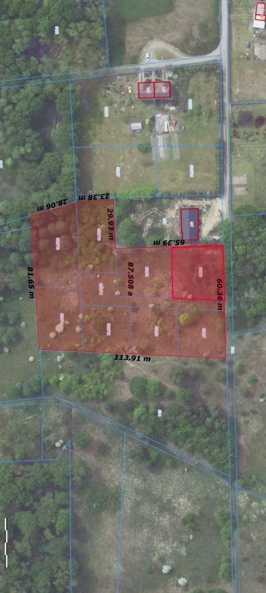 Oferowane działki mają powierzchnię od 810m2 do 1320m2, o foremnych kształtach, płaskie, częściowo zadrzewione, część terenu znajduje się przy lesie. Do działek prowadzi gminna droga w której znajduje się prąd, woda, kabel telefoniczny, brak kanalizacji oraz gazu w miejscowości.