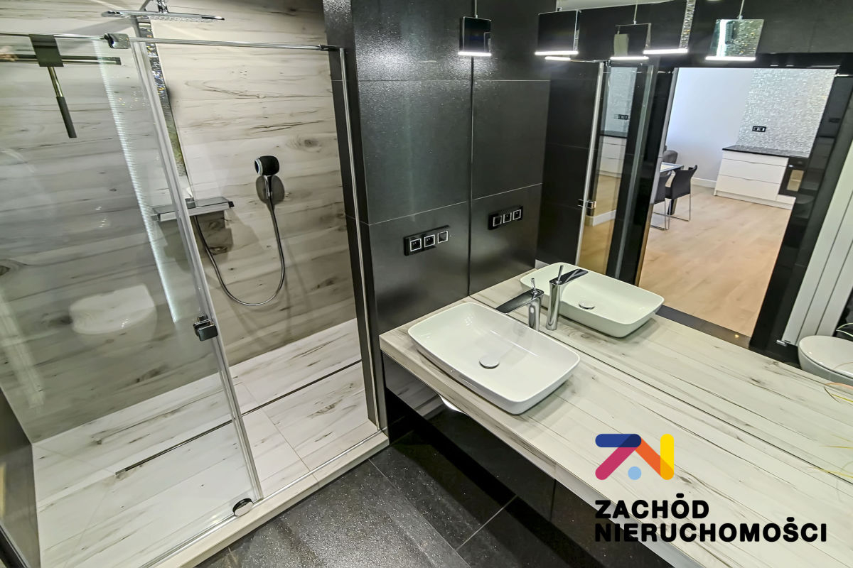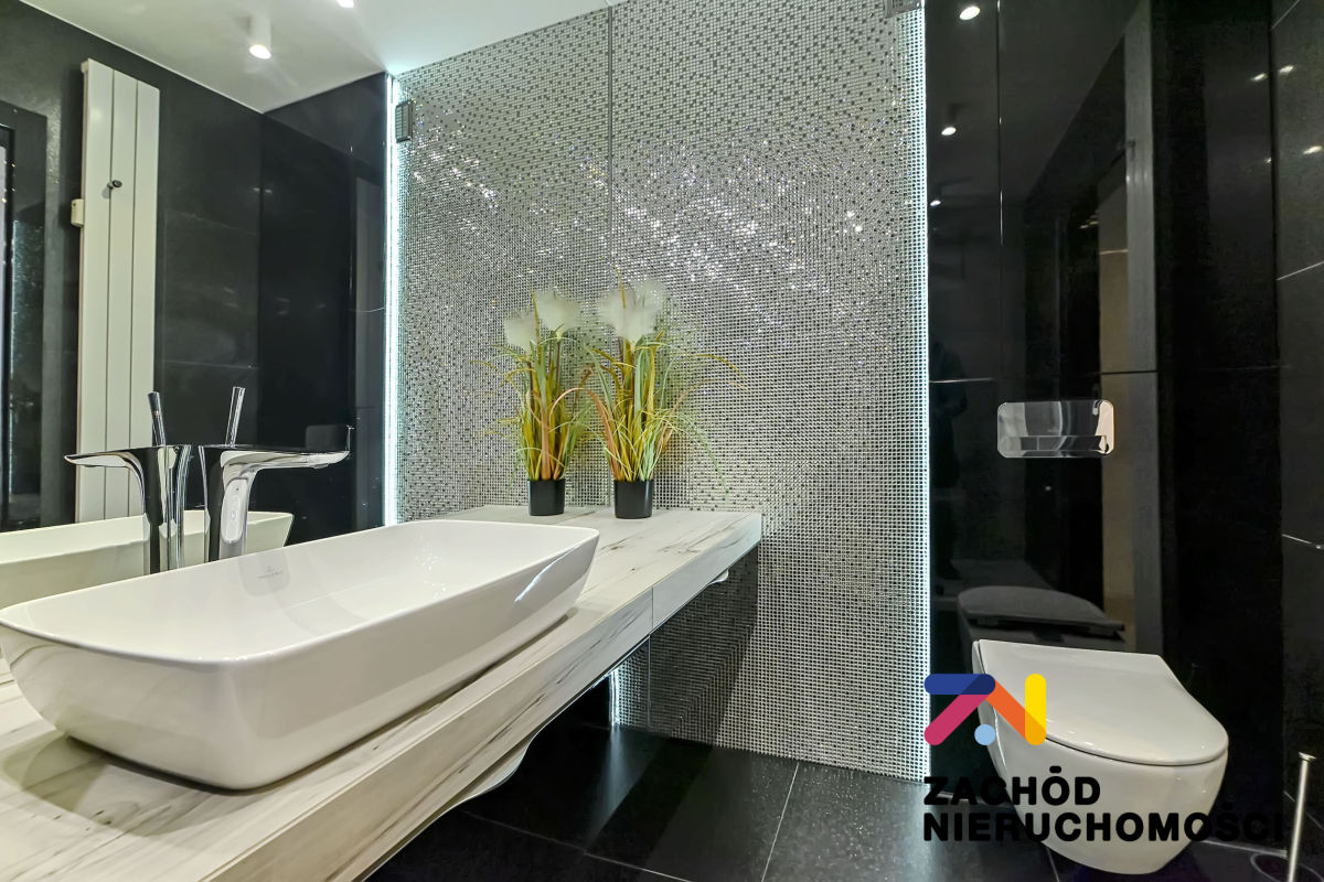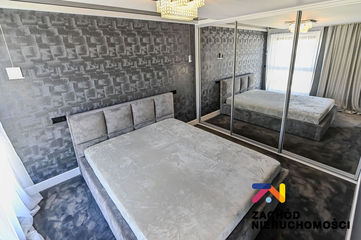 Na podłodze w salonie panele, w sypialni przytulna wykładzina, nowoczesne oświetlenie, ozdobne nowoczesne grzejniki, drzwi wewnętrzne oraz fronty kuchenne na wysoki połysk, blaty kuchenne granitowe,szklane gniazda elektryczne i włączniki.