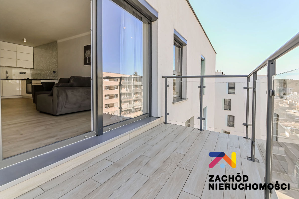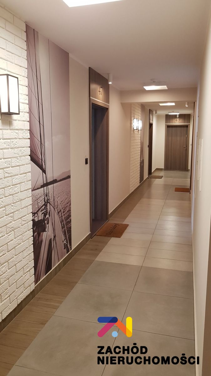 W apartamencie zaprojektowano nowoczesną kuchnię wykonaną na specjalne zamówienie wraz ze sprzętem AGD lodówką, zmywarką, płytą indukcyjną i piekarnikiem. Na wyposażeniu pozostaje również pralka oraz telewizor. Szafy wnękowe zaprojektowane w mieszkaniu podnoszą komfort użytkowania oferując funkcjonalność i estetykę.