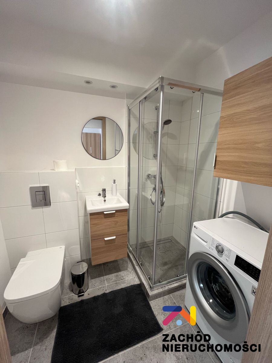 4)Łazienka z wc -kabina prysznicowa z deszczownicą, WC, umywalka z szafką, pralka, szafka wisząca, lustro.