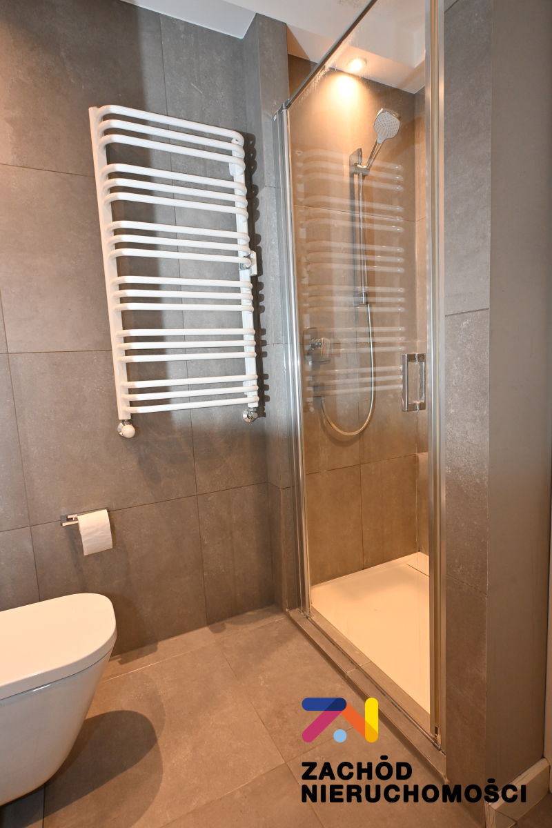 2. Łazienka wyposażona w prysznic, umywalkę, szafkę pod umywalką, pralkę, szafkę w zabudowie.