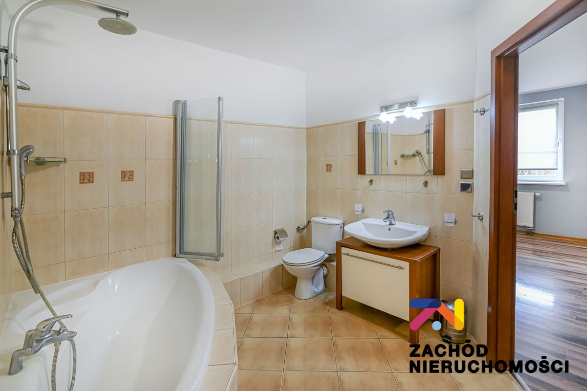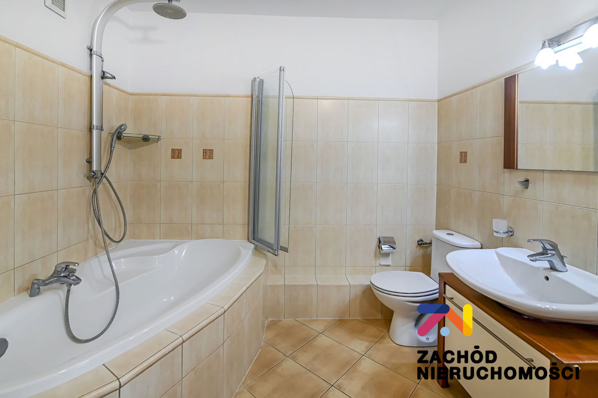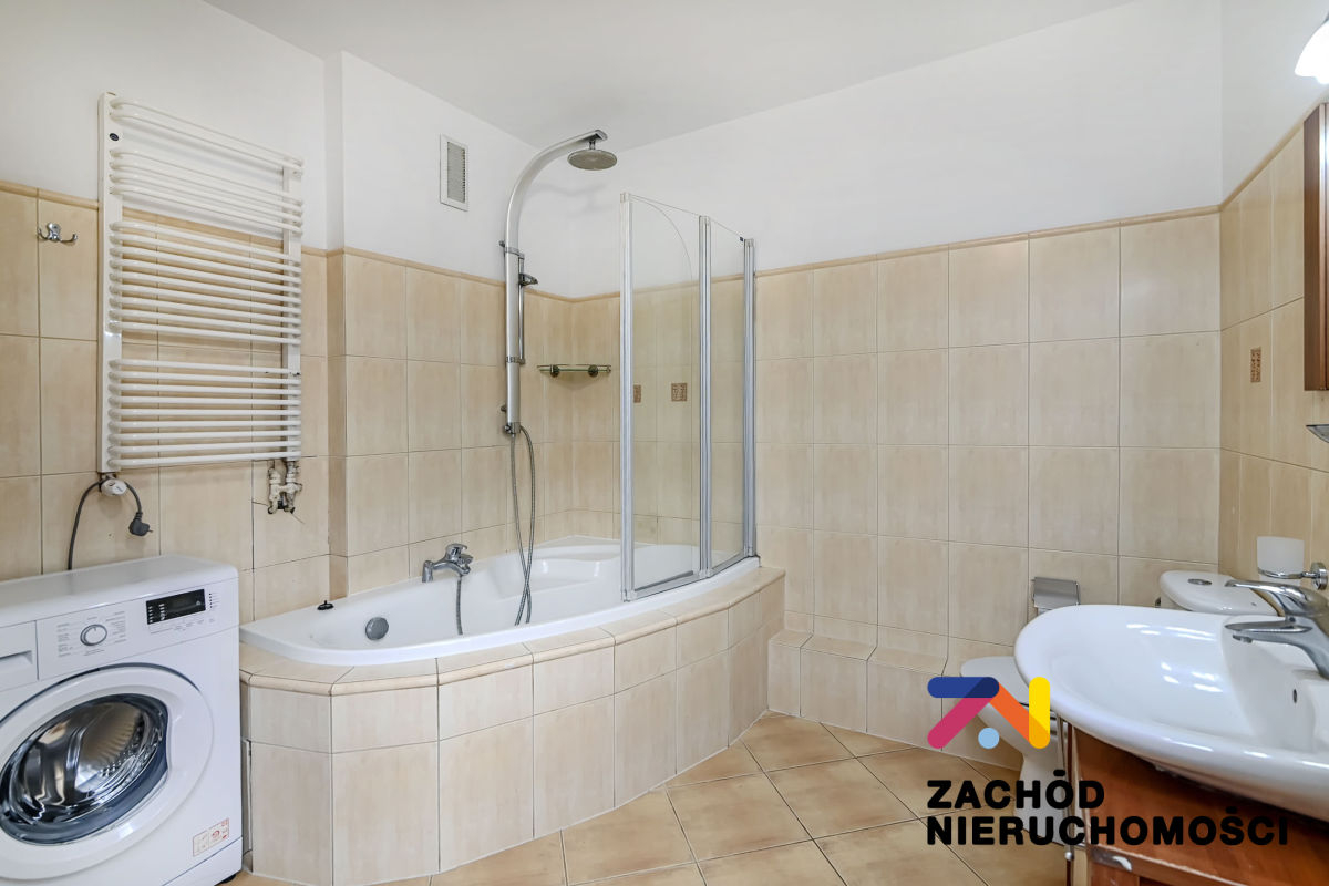 Przestronna łazienka z wanną narożnikową i opcją natrysku.