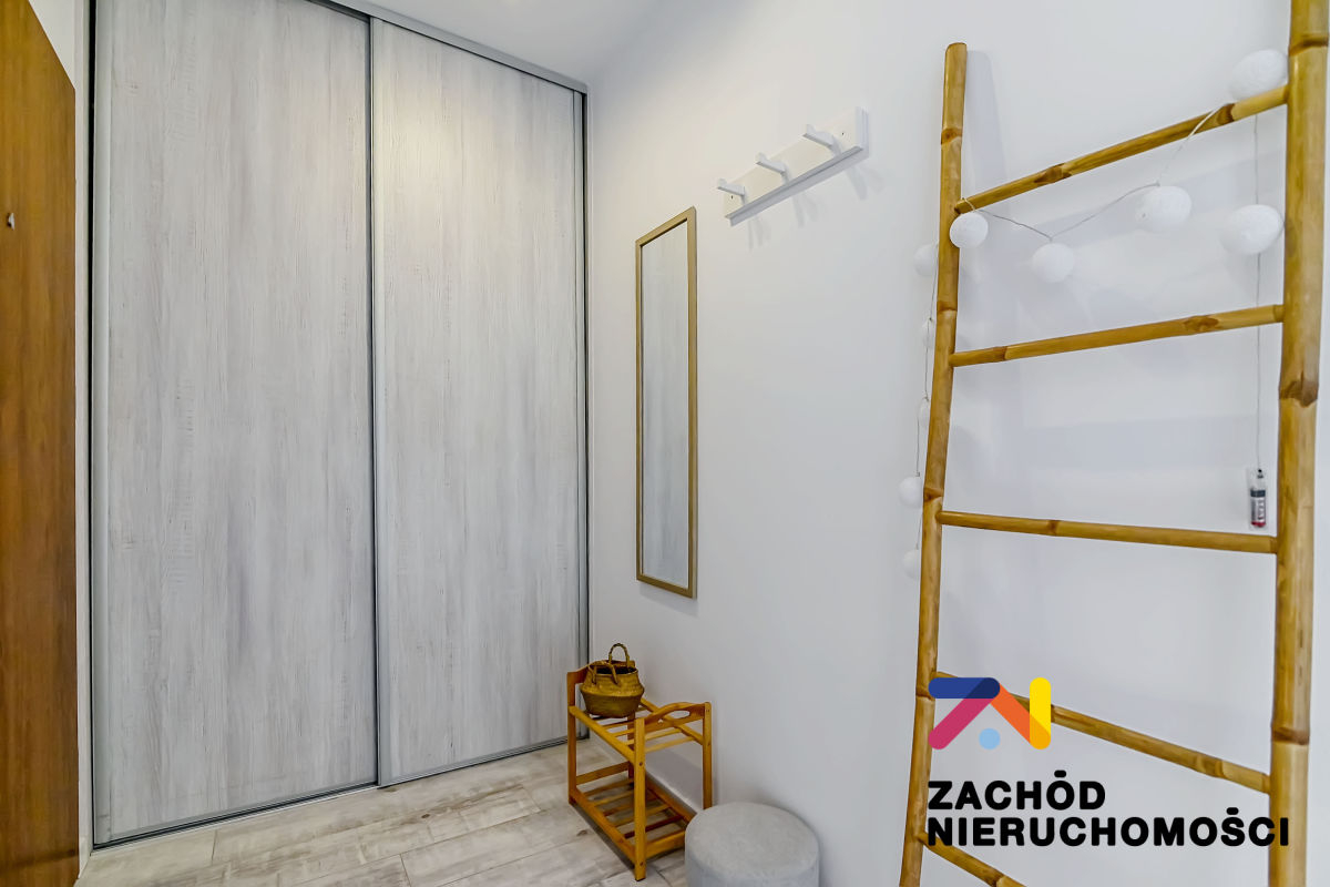 Dodatkowo w przedpokoju zabudowana została duża szafa na wymiar, zapewniająca sporo miejsca do przechowywania. Salon wyposażony jest w rozkładaną sofę, tworząc komfortową przestrzeń do wypoczynku i spotkań.
